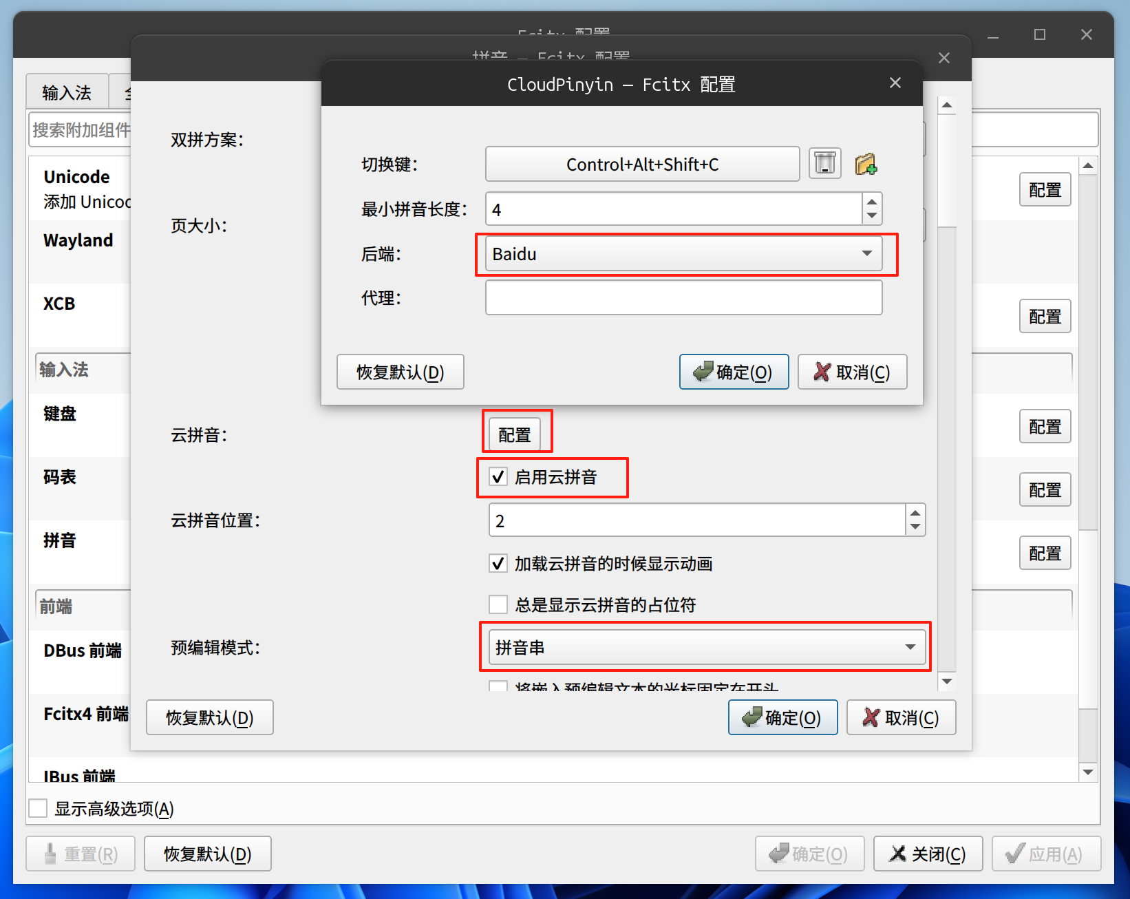 勾选“启用云拼音”选项,并配置云拼音后端为百度接口,同时将与编辑模式改为拼音串:
