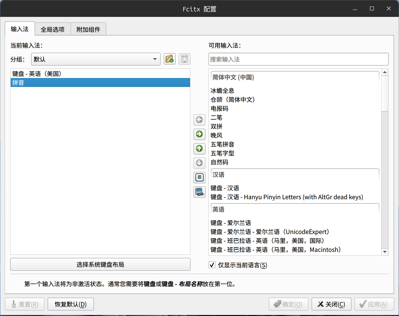 右键任务栏输入法图标打开配置窗口,从右侧添加“拼音”输入法,或者也可以安装其他例如Rime等输入法。