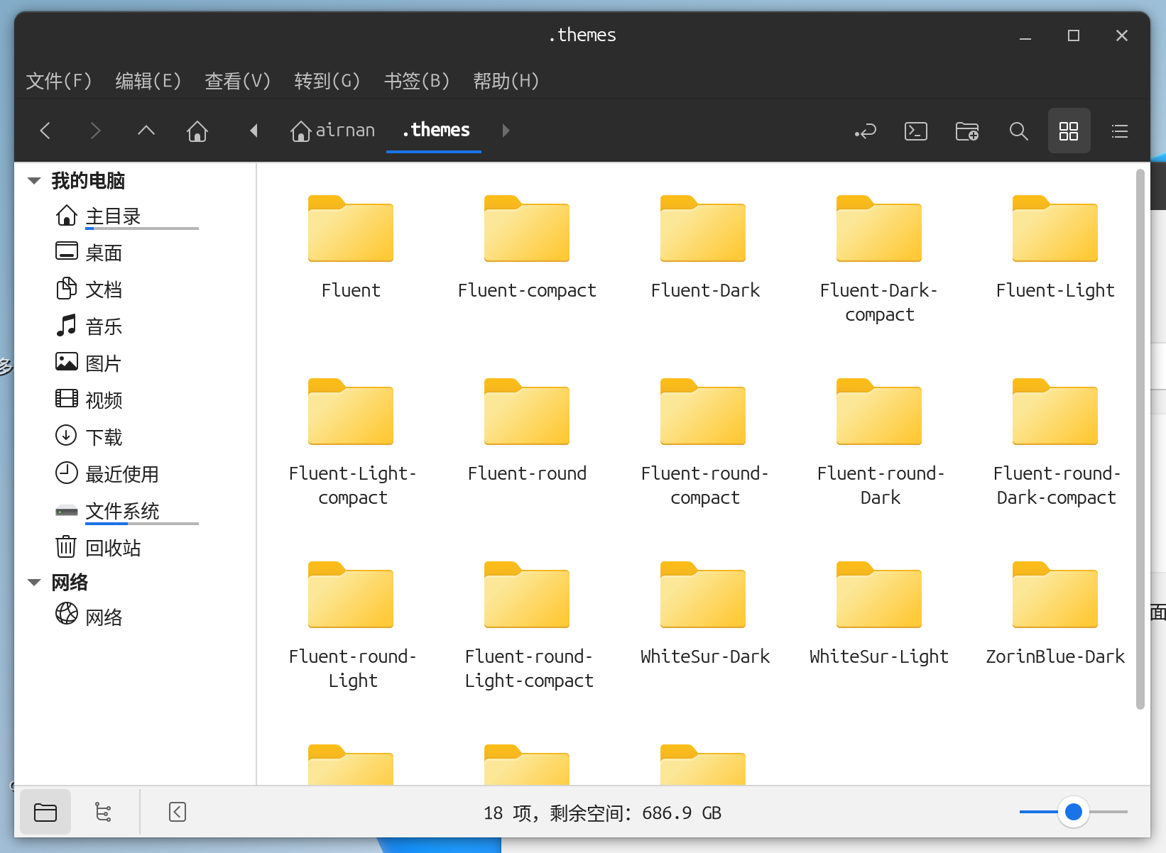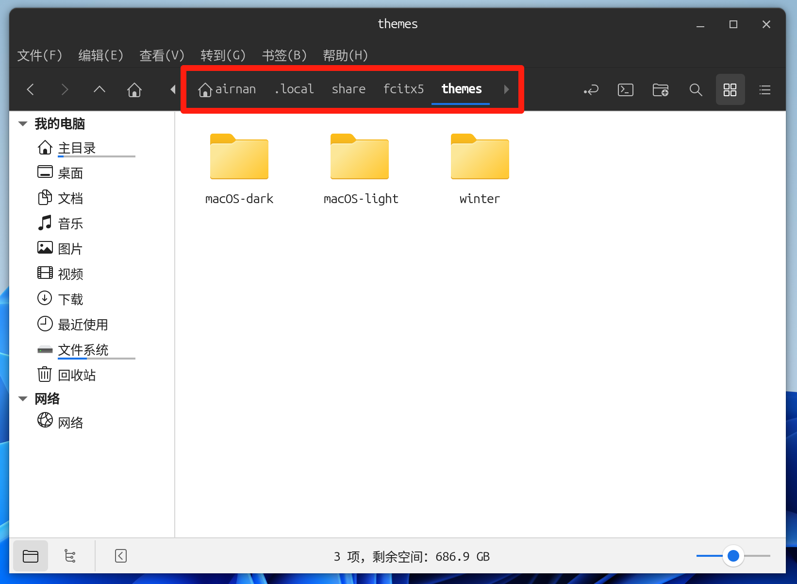 将下载好的主题解压放在对应目录,主题存放在用户目录下的.themes 文件夹中: