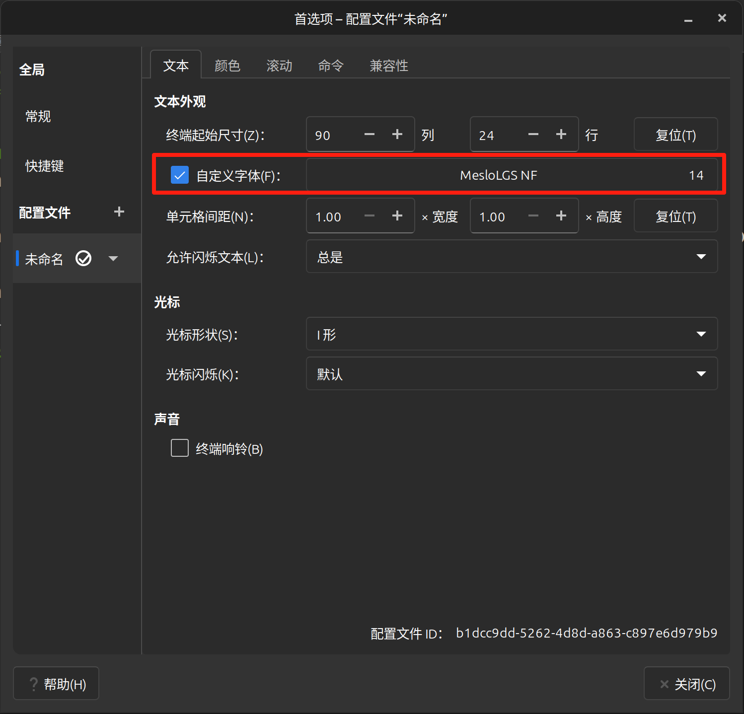 在终端首选项中修改自定义字体: