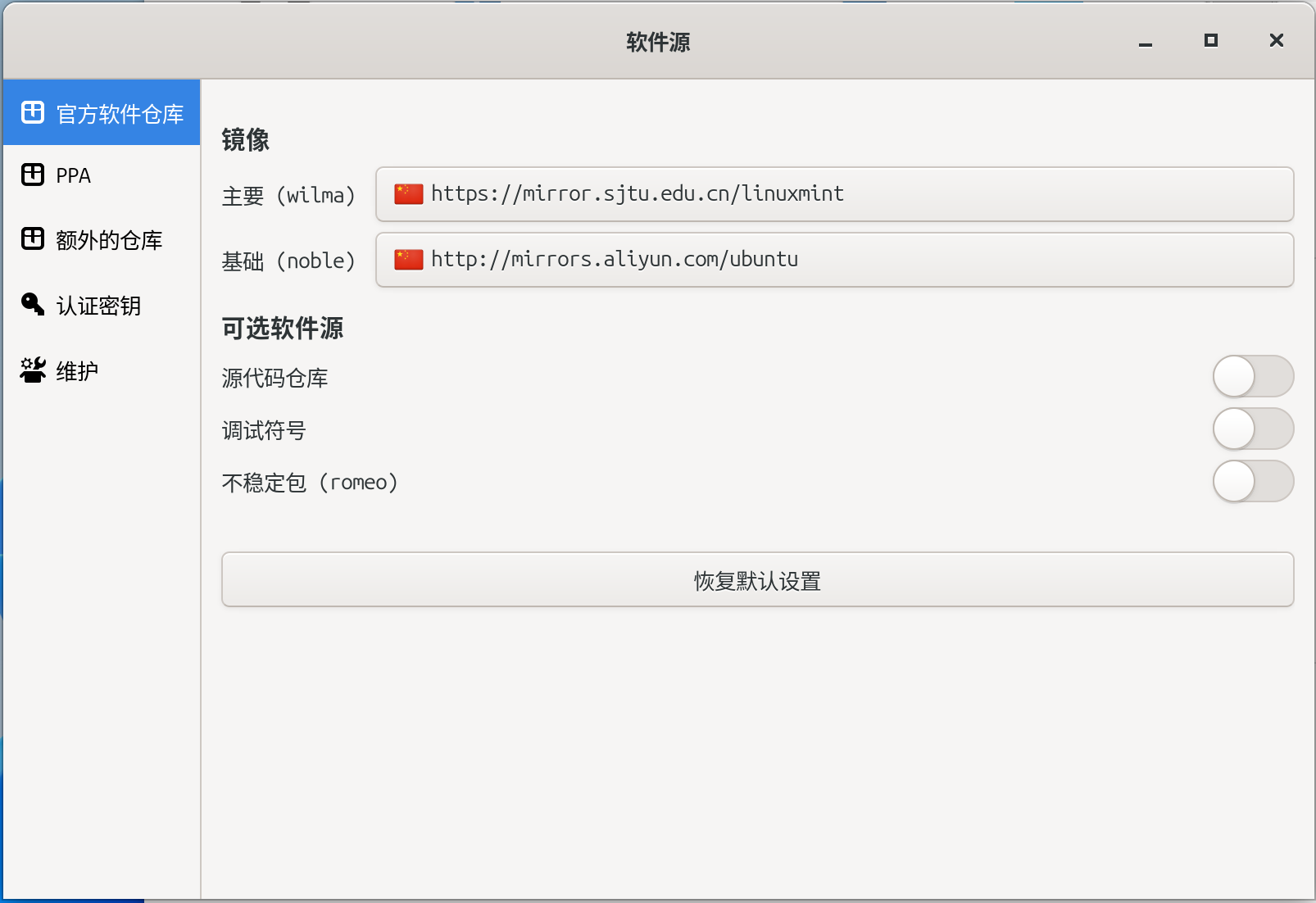 打开开始菜单,找到软件源设置,主要->Mint软件源,基础->Ubuntu软件源,各选择中国镜像源即可: