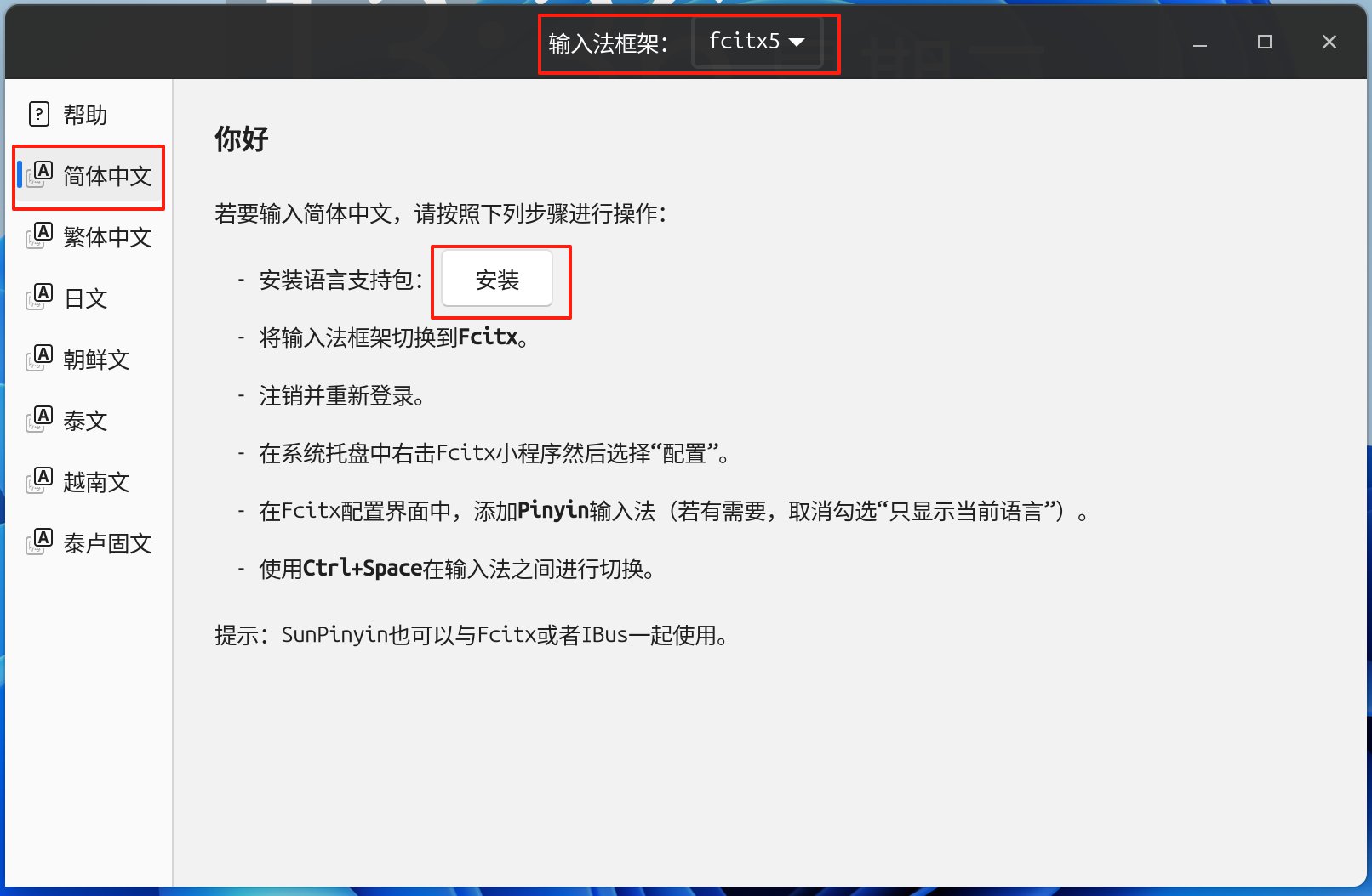 系统提供可视化入口,在开始菜单中找到输入法配置,选择想用的输入法框架,使用默认提供的框架的话建议选择Fcitx选项,然后在简体中文选项卡中安装语言支持包,而