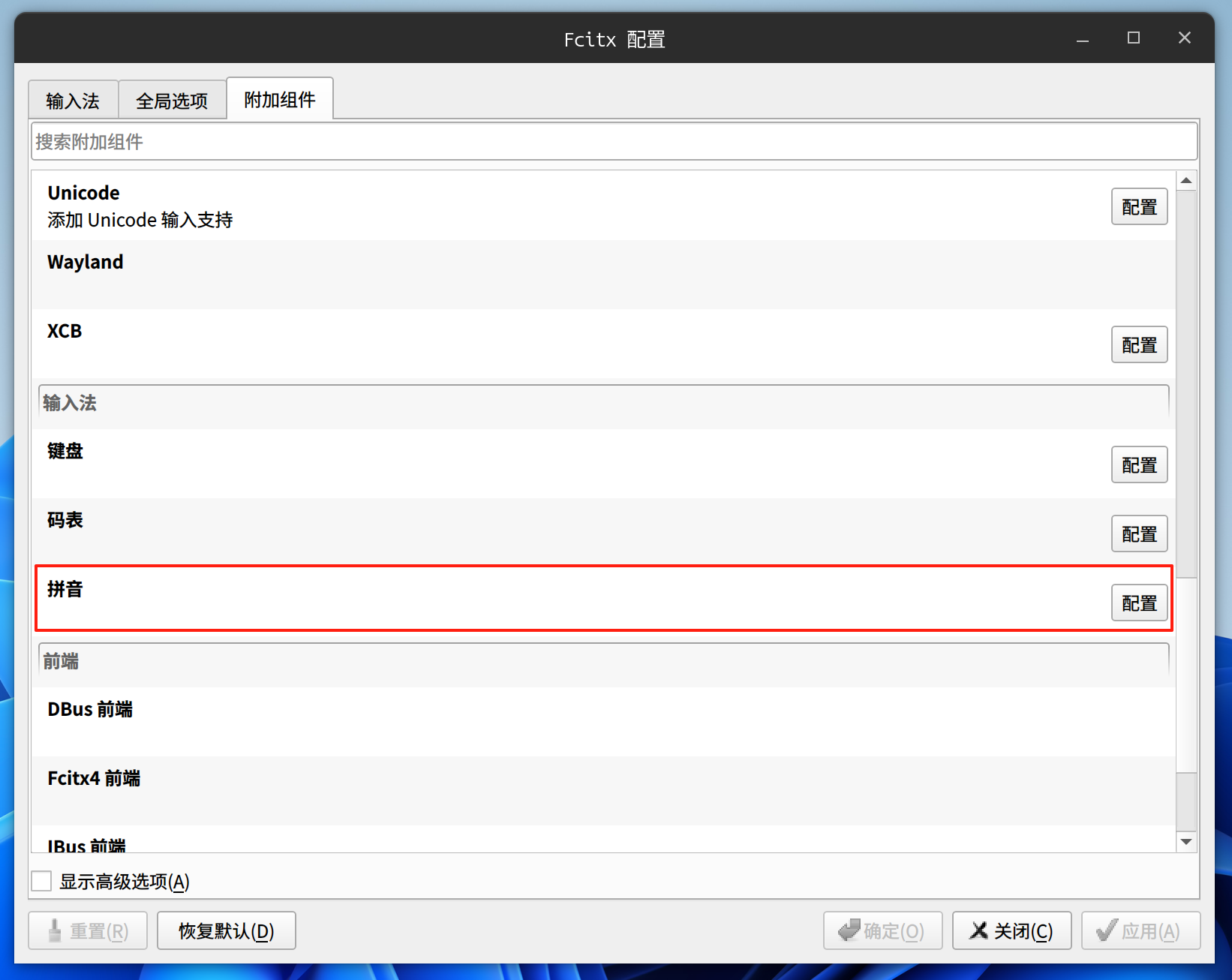 在附加组建选项卡中找到拼音配置项并打开: