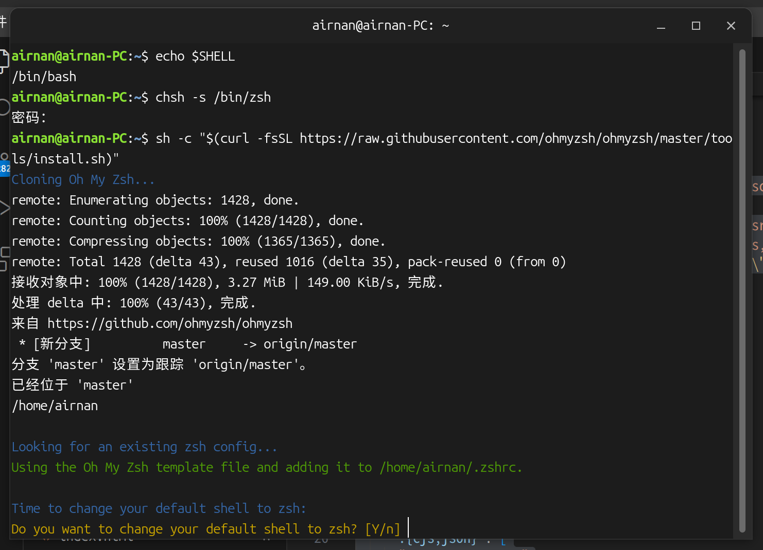 sh -c "$(curl -fsSL https://gitee.com/pocmon/ohmyzsh/raw/master/tools/install.sh)"安装时提示是否设置为默认shell,直接y下一步