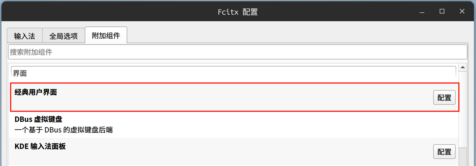 在输入法配置中找到“经典用户界面”配置: