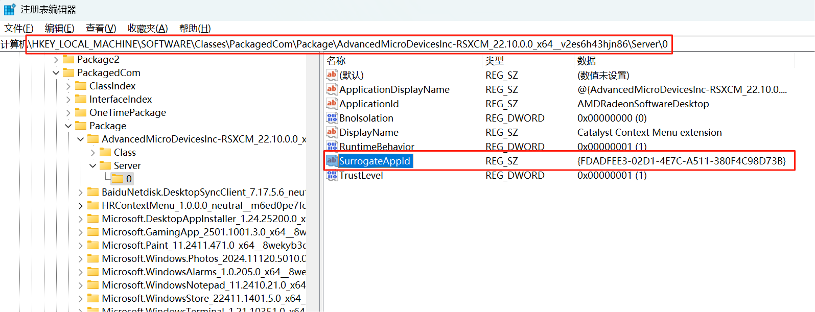 前往注册表HKEY_LOCAL_MACHINE\SOFTWARE\Classes\PackagedCom\Package\AdvancedMicroDevicesInc - XXXXXXXX\Server\X,其中有个字段SurrogateAppld ,它的值即为ID,我们可以复制到记事本临时存储一下。